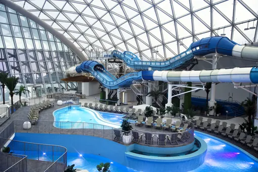 В одном куполе аквапарка — 17 водных горок и аттракционов для любого возраста. Во втором — зона релакса, где можно почувствовать себя на морском побережье. Купола пропускают солнечный свет и ультрафиолет, поэтому даже зимой здесь можно «загорать». Есть возможность арендовать приватное бунгало с отдельным бассейном на целый день.