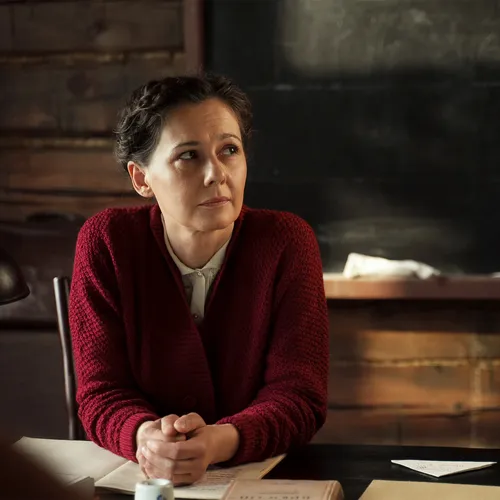 В роли учительницы, чья судьба тесно переплетается с драматической историей писем с фронта.