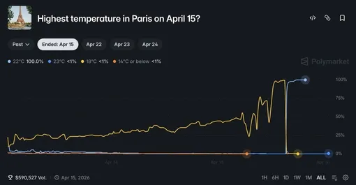 В этот момент на платформе Polymarket один из пользователей выиграл 14 тысяч долларов, поставив на сценарий, согласно которому температура в Париже превысит 21 градус. Примечательно, что аккаунт победителя был создан всего за два дня до этого события.