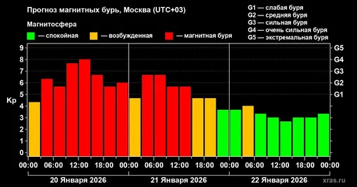 Причиной нынешнего экстремального события стала мощная вспышка класса X с индексом X1.95, которая сопровождалась крупным выбросом корональной массы. В ночь на 20 января солнечное вещество достигло Земли и столкнулось с магнитосферой планеты. Это привело к резкому возмущению магнитного поля и вызвало яркие полярные сияния, которые наблюдались в ряде регионов. Однако уже после часа ночи по московскому времени параметры магнитного поля начали меняться, и интенсивность сияний заметно снизилась.