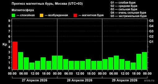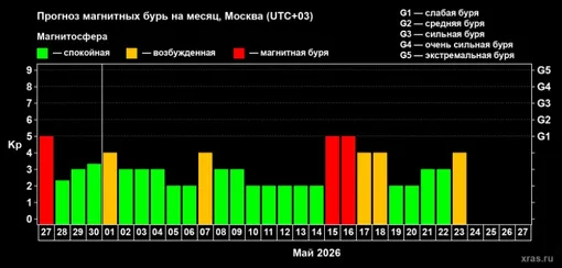 Ожидаются колебания на уровне 2 баллов с отдельными периодами усиления. Вероятность возникновения магнитной бури составляет 3%.