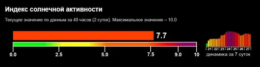 За последние сутки на Солнце произошло 17 вспышек. Большинство из них были слабыми, однако два выброса достигли уровня M — это предпоследний по мощности класс. На этом фоне индекс солнечной активности подскочил до 7,7 балла, что соответствует четвертому уровню из пяти возможных и указывает на заметное усиление активности на поверхности звезды.