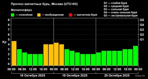 По предварительным данным, уже после полуночи по московскому времени Kp-индекс — ключевой показатель геомагнитной активности — резко поднимется до 4,5 балла, что приведет к небольшому геошторму. Для понимания, магнитные бури категории G1 начинаются с отметки в 5 баллов, так что предстоящие возмущения находятся на грани этого порога. Ожидается, что обстановка начнет стабилизироваться к утру, однако затишье будет недолгим.