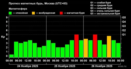При этом ученые не исключают, что буря затянется. По прогнозам, 26 ноября в течение дня возможно несколько серий геомагнитных возмущений.