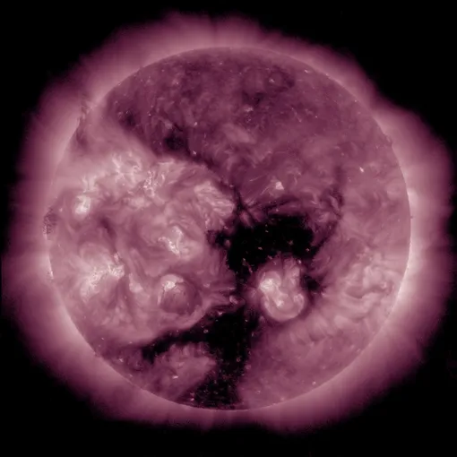 «Корональная дыра на данный момент, откровенно говоря, еще очень сильно не дошла до тех углов, с которых поток ветра должен был прийти к Земле. Это примерно 50 градусов к западу (направо) от центра видимого диска. Даже удивительно в этой связи смотреть на графики, но характер измерения скорости и плотности газа не оставляет сомнений в природе пришедшего к Земле быстрого потока: это плазма, родившаяся в корональной дыре», — говорится в сообщении.