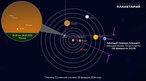 Вечером 28 февраля на небе можно будет увидеть сразу шесть планет: Меркурий, Венера, Юпитер, Сатурн, Уран и Нептун. Четыре из них составят так называемый малый парад, оказавшись в узком секторе неба шириной около 20 градусов. Планеты выстроятся вдоль изогнутой линии в нескольких созвездиях. У западного горизонта, в районе созвездия Рыб, окажутся Меркурий, Сатурн и Нептун. Венера расположится в Водолее. Выше, на юго-западе, в созвездии Тельца, недалеко от скопления Плеяды, можно будет найти Уран. Юпитер появится на юго-востоке — в созвездии Близнецов. Как рассказали в Московском планетария, самые яркие из них — Юпитер, Сатурн и Венера — будут видны невооруженным глазом. Меркурий, скорее всего, получится разглядеть только в бинокль, а Нептун и Уран — лишь в телескоп.