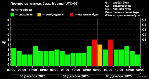 По предварительным данным, в субботу Kp-индекс, обозначающий геомагнитную активность, будет колебаться в пределах 2–3,5 баллов. С 12:00 до 15:00 показатель приблизится к опасной отметке 4 балла. Напомним, что магнитная буря категории G1 начинается с 5. Ученые допускают, что небольшие возмущения могут перерасти в полноценную магнитную бурю. Вероятность такого сценария составляет 26%.