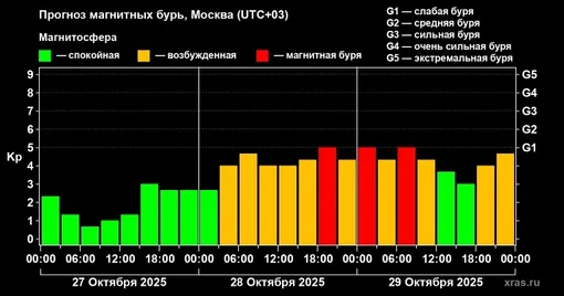 Согласно прогнозам, уже завтра геомагнитная обстановка начнет ухудшаться. После 18:00 по московскому времени специалисты ожидают начало магнитной бури. По предварительным данным, сила возмущений не превысит 5 баллов, что соответствует слабой буре категории G1. Ученые предупреждают, что планету может «штормить» три дня. Стабилизация обстановки ожидается только к 31 октября.