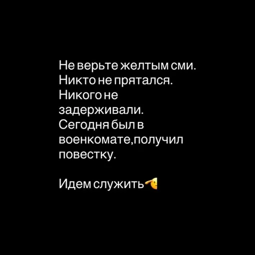 Но что факт, так это то, что музыкант сегодня действительно был в военкомате. Он сообщил это в своих социальных сетях, отреагировав на новости о своем задержании. Артист призвал аудиторию не слушать желтую прессу, не верить слухам, которые разгоняют в сети, а также подтвердил факт получения повестки.
