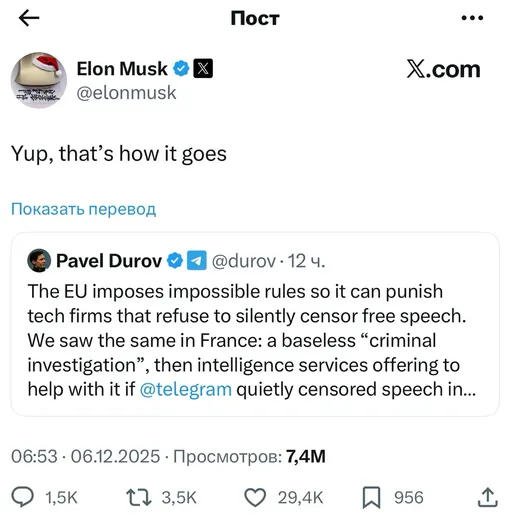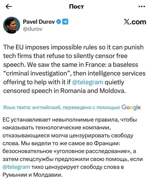 Дуров начал соглашаться с Илоном Маском и в очень грубой форме раскритиковал европейские власти: «Евросоюз вводит невыполнимые правила, чтобы наказывать технологические компании, которые отказываются тихо цензурировать свободу слова. Мы видели то же самое во Франции: беспочвенное "уголовное расследование", а затем предложение со стороны спецслужб помочь закрыть дело, если Telegram негласно будет цензурировать высказывания в Румынии и Молдове».