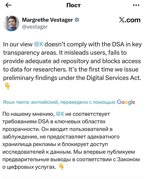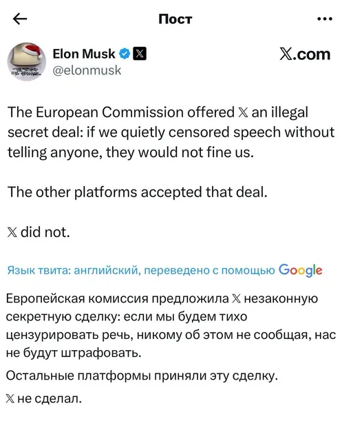 Илон Маск, которому принадлежит социальная сеть, был очень недоволен внезапным штрафом. X — далеко не самый прибыльный актив в его империи (а даже убыточный), поэтому любой, даже минимальный штраф воспринимается крайне болезненно. К тому же Маску явно не нравится законодательство Евросоюза, о чем он и рассказал в X после получения штрафа.