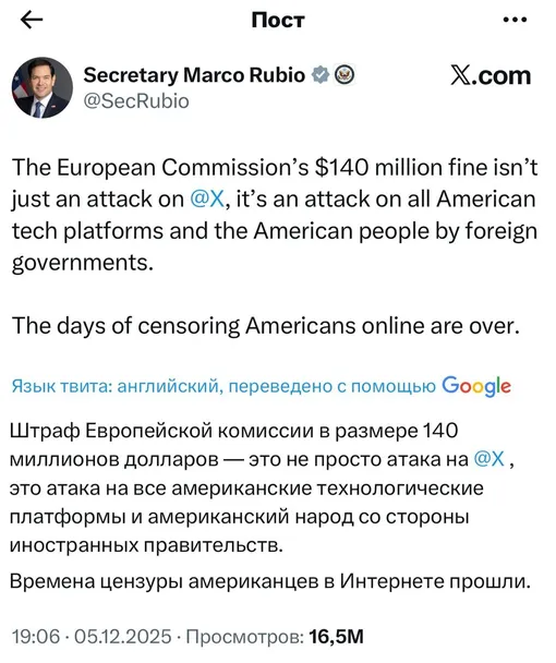 «Штраф Европейской комиссии — это атака на всю Америку со стороны иностранных государств. Но времена цензуры американцев прошли», — написал Марко Рубио.