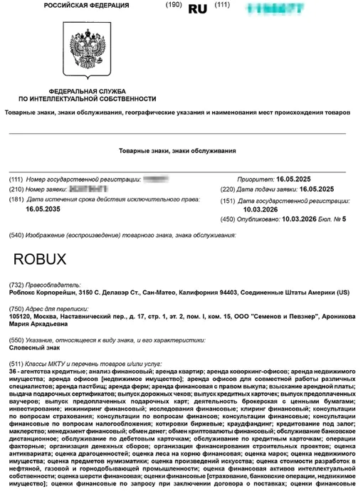 Зарегистрированный товарный знак охватывает целый ряд услуг – денежные переводы, платежи через электронные кошельки, торговлю криптовалютой, а также прочие финансовые возможности. Правообладателем бренда значится штаб-квартира Roblox Corporation в городе Сан-Матео, штат Калифорния, США.