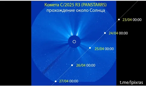 Как рассказали в Лаборатории, в минувшее воскресенье, 19 апреля, C/2025 R3 прошла точку перигелия на расстоянии около 75 миллионов километров от поверхности светила. Пролет на такой дистанции оценивается как безопасный для целостности ядра, и в настоящий момент комета движется по траектории удаления от Солнца.