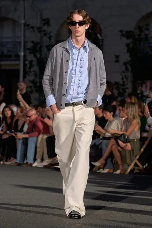 Несмотря на усилия отдельных брендов (таких, например, как Celine), большого возвращения узких джинсов и не случилось: одеваться в стиле хипстеров из 2010-х не актуально сейчас и не будет модно в следующем году. Тем не менее, многолетнее засилье широких джинсов закончилось: всем, кому этот фасон не идет или просто не нравится, рекомендуем джинсы slim fit, как на показе Dior — этот силуэт идет всем. Добавьте к ним свитер и кеды, и образ готов — ничего сложного.