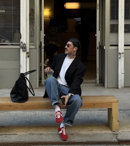 Синие джинсы, белая футболка, черный блейзер прямого кроя — беспроигрышная формула успешного образа со времен 90-х. Ее можно обыгрывать по-разному: заправьте футболку, подверните джинсы, расставьте акценты с помощью ярких кроссовок и модных проводных наушников.