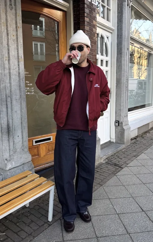 Чтобы такой образ не выглядел слишком спортивно, выбирайте темные благородные цвета, например, бордовый, который отлично сочетается с классическим денимом. Кеды в таком комплекте можно заменить на аккуратные лоферы или топсайдеры.