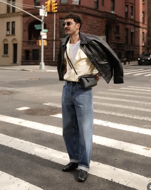 Если на улице совсем разжарело, можно вспомнить летние правила многослойности: белая майка или футболка облегающего фасона, свободная рубашка, кожаная куртка или бомбер. С таким набором уже и обычные джинсы не выглядят буднично.