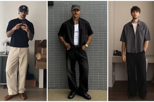 - Сбалансированные пропорции: верхняя часть одежды должна быть более аккуратной (приталенной или заправленной) или свободной (куртка-бомбер), чтобы создать контраст с широкими штанинами и избежать неряшливого вида.