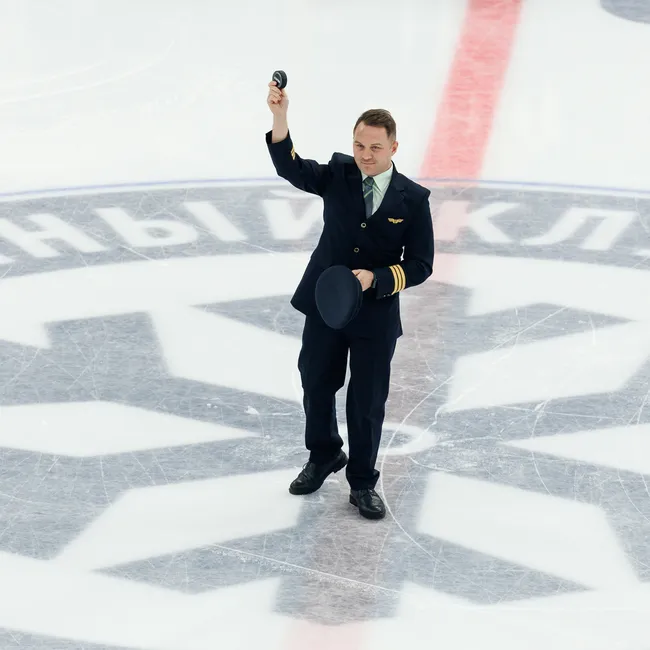 Карен Новицкий поучаствовал в матче КХЛ между «Сибирью» и «Трактором»: пилот вбросил символическую шайбу