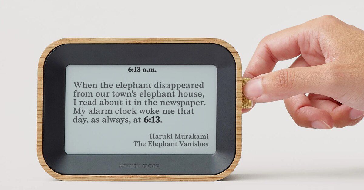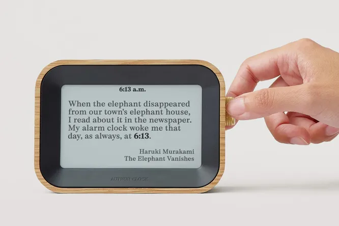Author Clock — это часы, которые не просто показывают время, а отображают цитаты из книг, где используется конкретная временная отметка. E-ink дисплей (4.3″ или 7.8″) каждую минуту выводит новую строку, где время зашифровано в тексте. Библиотека включает 13 000+ цитат от 2 500 авторов, поэтому повторов почти не бывает. Корпус из массива дуба и латунная головка управления делают их не только оригинальным гаджетом, но и стильным элементом интерьера.