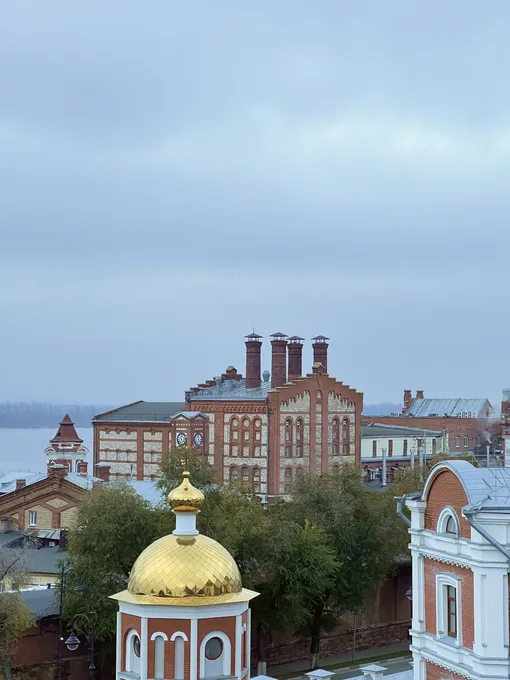 После заселения я сначала забежал в кафе неподалеку, а потом отправился на прогулку, маршрут которой предусмотрительно был проложен за пару дней до путешествия. Первая остановка — театр драмы и прилегающий к нему сквер Пушкина. Сначала мне показалось, что там почти никого нет, но через несколько секунд я услышал голоса нескольких десятков детей и экскурсовода, который пытался их перекричать. Тем контрастнее смотрелись местные жители, которые просто пришли посидеть на лавочках, — они будто не замечали толпу возле смотровой площадки. С нее, кстати, открывается очень симпатичный вид на Волгу, легендарный самарский пивзавод (может, это и есть источник того самого гедонизма?) и монастырь.