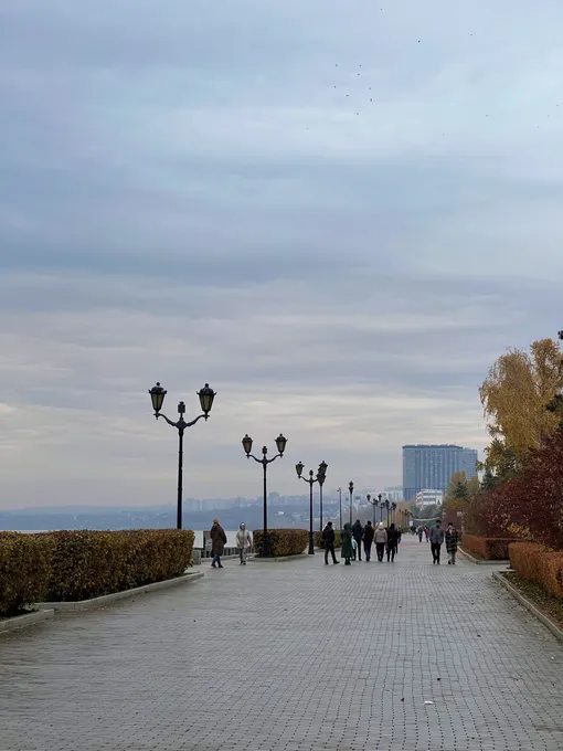 Сказать, что с нее открывается потрясающий обзор на город, — это ничего не сказать. Самара, с годами превращаясь в настоящий мегаполис, растянулась вдоль реки на несколько десятков километров, и сначала мне показалось, что передо мной предстал обычный практически курортный город. Но уже через несколько минут я понял, что ошибался — в середине дня на набережной было не так много людей, но все они просто наслаждались осенней прохладой, гуляли с детьми или вели тихие беседы среди деревьев.