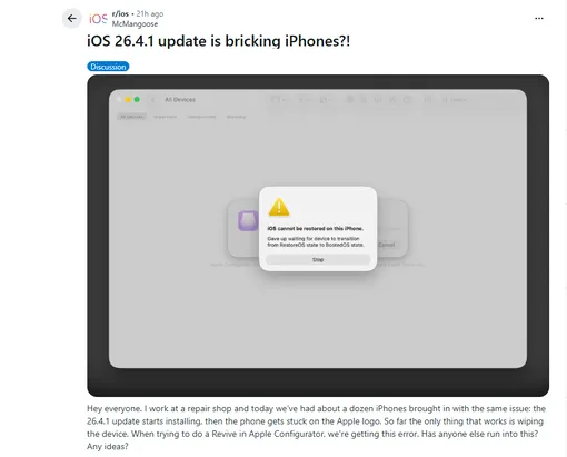 Вчера по телеграм-каналам начала распространяться тревожная новость: обновление на iOS 26.4.1 превращает айфоны в кирпичи. Помогает только полный сброс устройства в сервисном центре с потерей данных.
